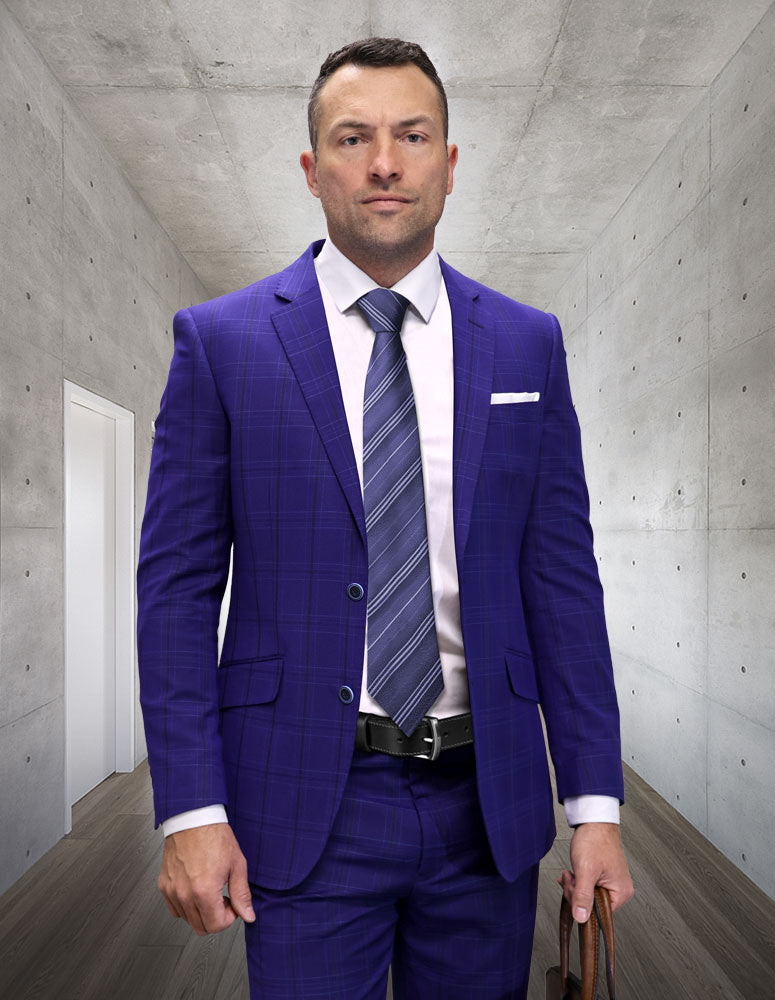 3PC Single BREASTED 1 BUTTON PEAK LAPEL PLAID SUIT WITH SOLID COLOR MATCHING VEST. SUPER 200'S ITALIAN WOOL AND CASHMERE. MODERN FIT FLAT FRO...