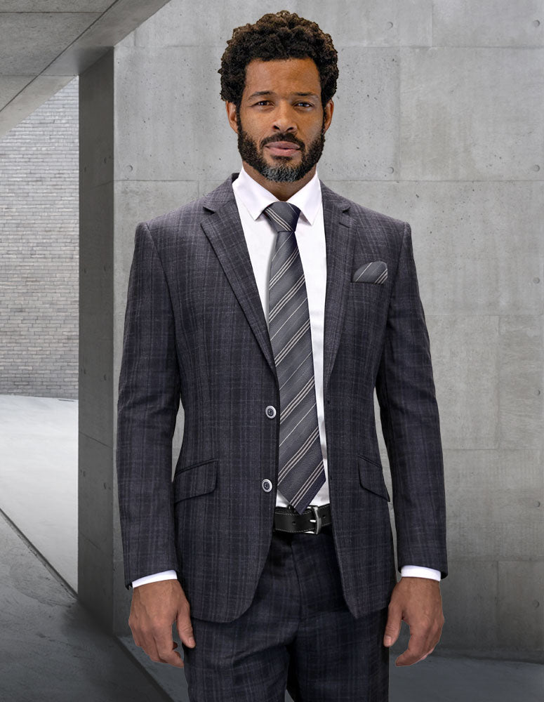 3PC Single BREASTED 1 BUTTON PEAK LAPEL PLAID SUIT WITH SOLID COLOR MATCHING VEST. SUPER 200'S ITALIAN WOOL AND CASHMERE. MODERN FIT FLAT FRO...