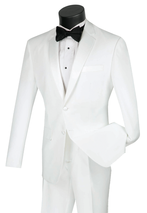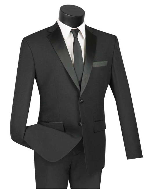 Single breasted 2 buttons, slim fit tuxedoSide vents, flat front pants, solid color.