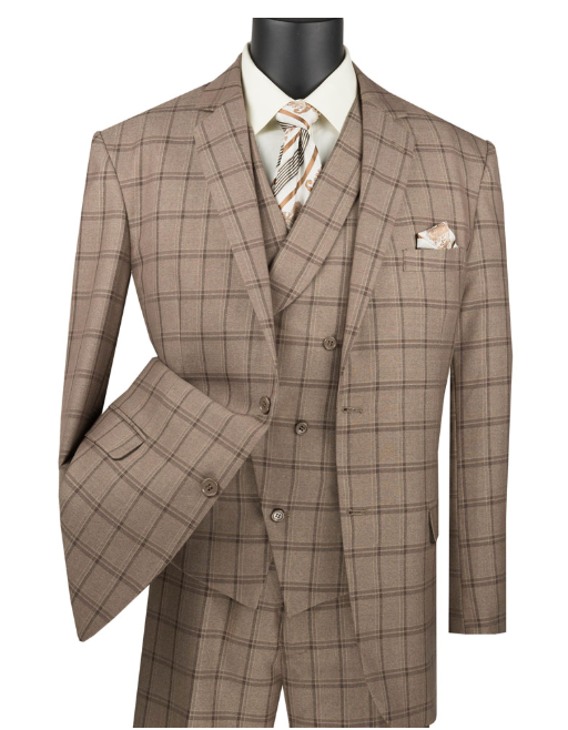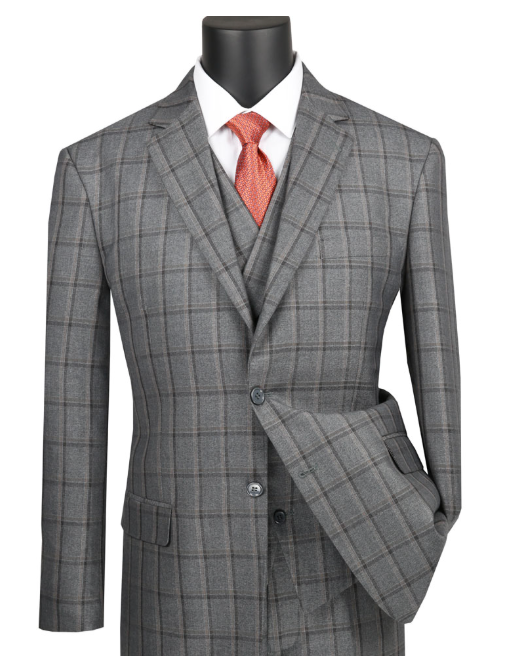 Classic 3 Pieces Suits. Single breasted 2 buttons, 3 pieces vested suits. Side vents, single pleated pants, windowpane