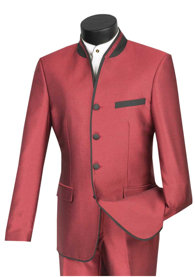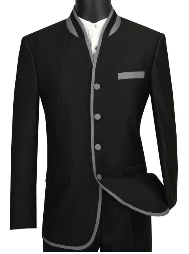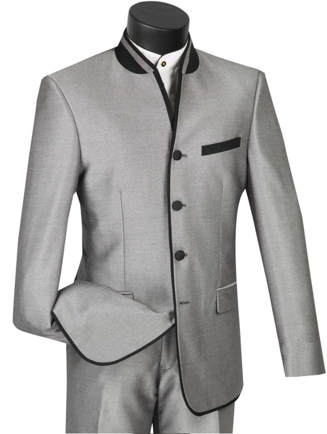 Single breasted 4 buttons, slim fit banded-collar suit with trim side vents, flat front pants, sharkskin.
