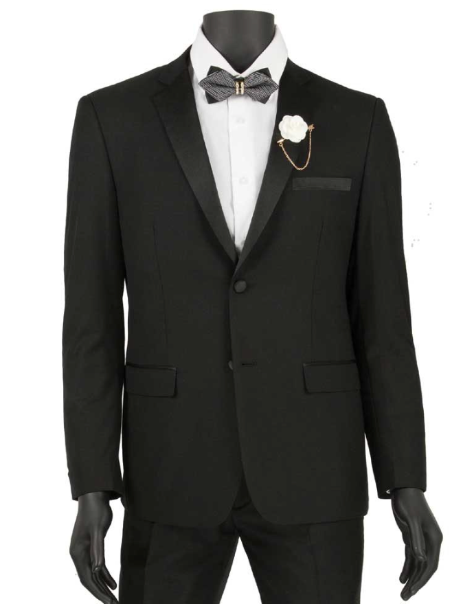Single breasted 2 buttons, ultra slim tuxedo,Side vents, flat front pants, solid color.